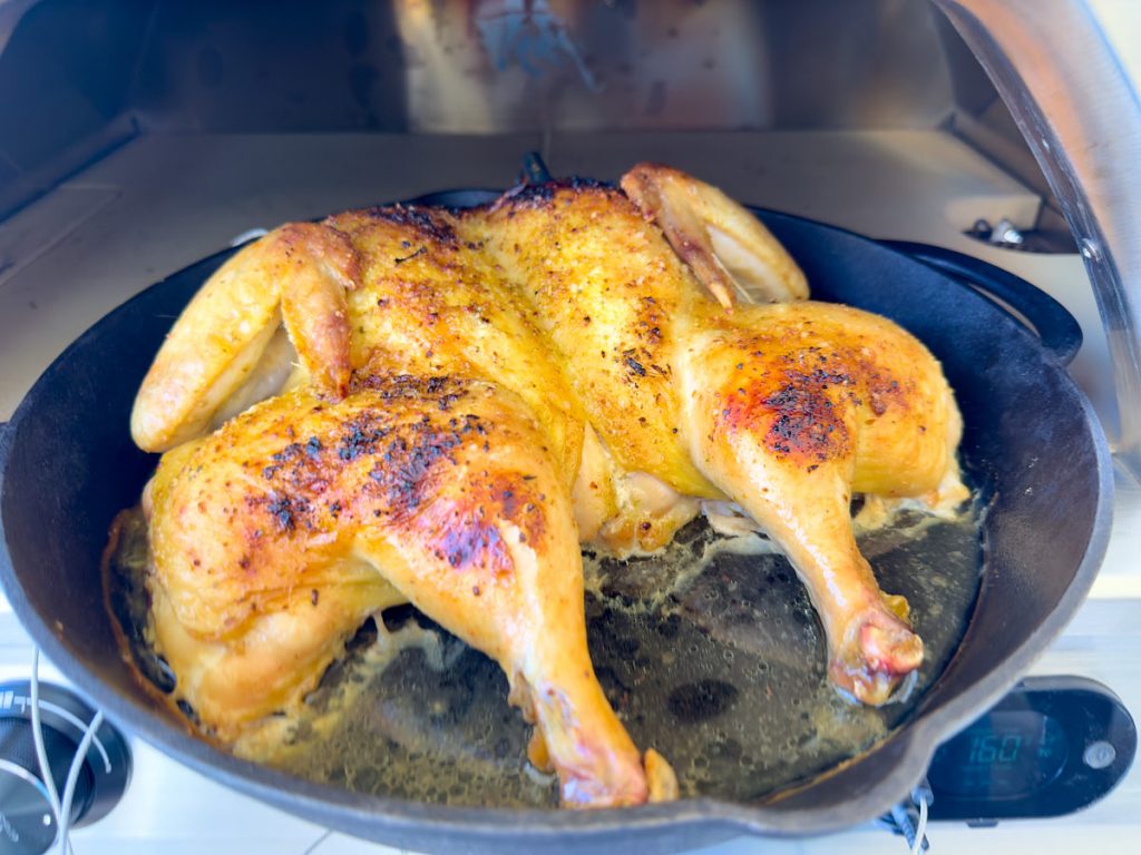 Cast Iron Garlic And Herb Spatchcock Chicken Grilled in a Bull Pizza Oven
