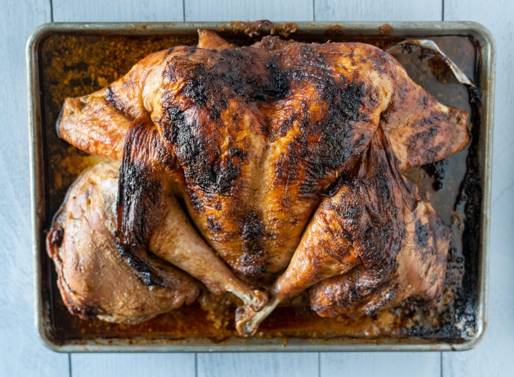 3. Place turkey on sheet pan and place on the grill using indirect heat to grill to an internal temperature of 165 degrees.