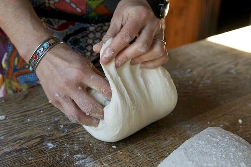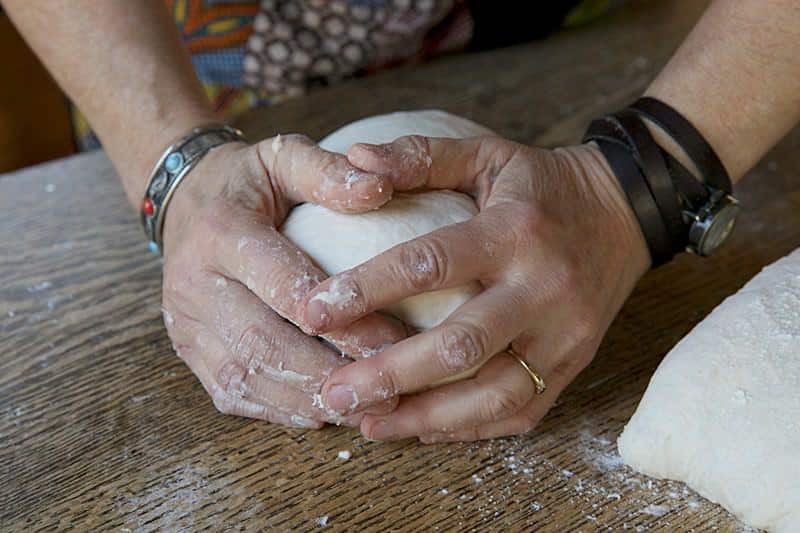 Create a tight ball: To shape the dough into a ball, use both hands and start from edges, pulling them towards the center while rotating the dough. Continue this motion, gradually increasing the tension as you shape the ball. The goal is to create a smooth, tight surface on the bottom.