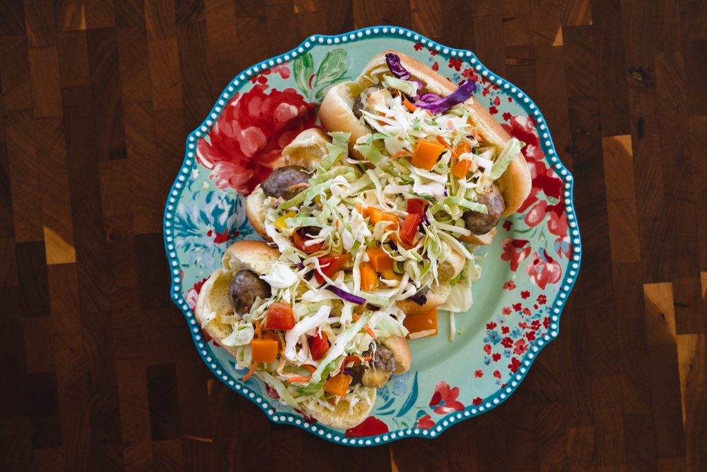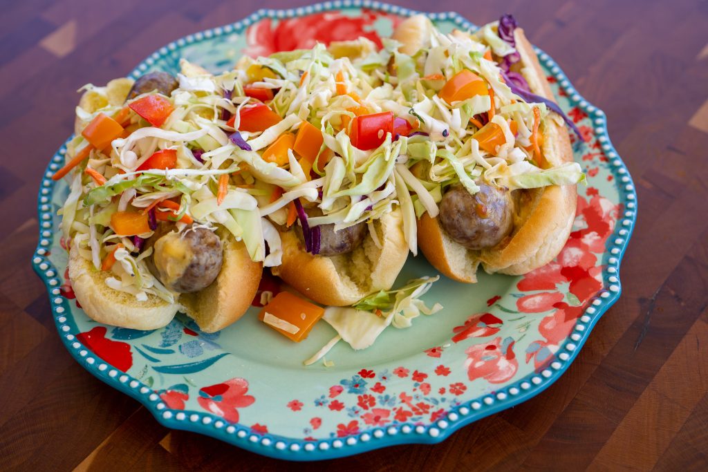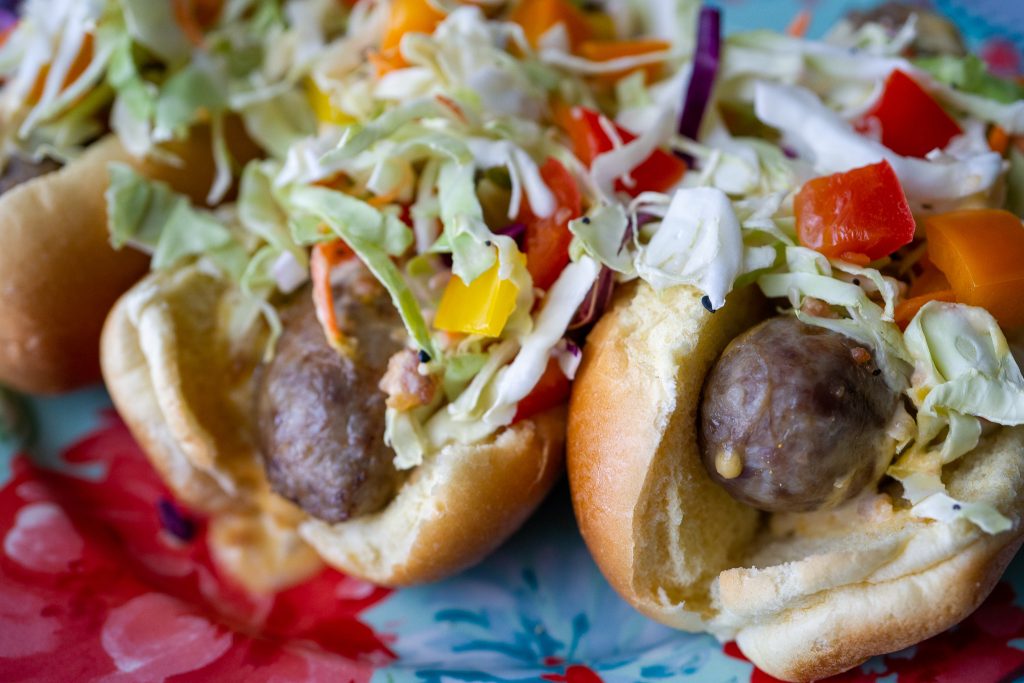I love the crunchy texture raw cabbage gives my brats but I also enjoy grilling whole cabbage and then shredding it myself. Grilling the cabbage gives the slaw more complexity.