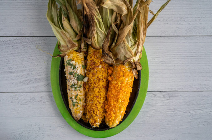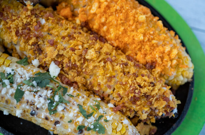 - Remove the corn from the grill and spread the elote crema liberally on each side of the corn. Top with your favorite elote toppings and serve immediately.
