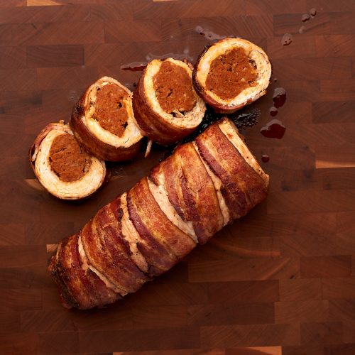 2. Place the turkey breast on a foil lined sheet tray. Lay strips of bacon under the turkey. Season both sides of the turkey breast with salt and Bull Burger Rub. Place the chorizo in the center of the turkey lengthwise. Roll the flattened turkey breast around the chorizo and then wrap the bacon around the turkey so that the seam is under the turkey.