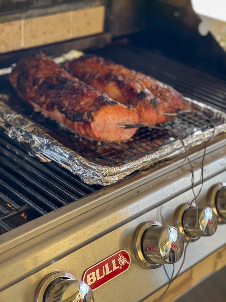 Grilling a pork loin directly over the heat may cause it to dry out. That’s why I use the indirect cooking method on the Bull Grill. To achieve indirect heat turn your innermost burners completely off and your outer burners to medium heat. In order to help avoid overcooking my pork. I always use a wireless thermometer to monitor the internal temp.
