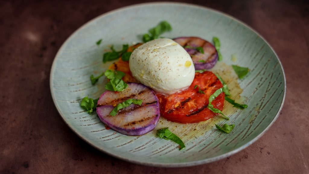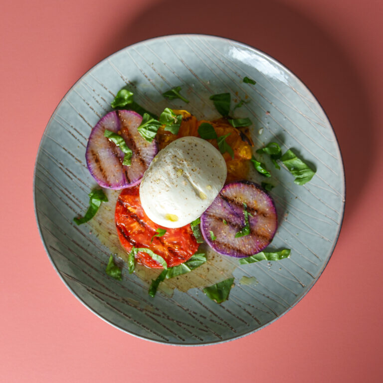 Grilled Heirloom Tomato & Purple Daikon Burrata Salad