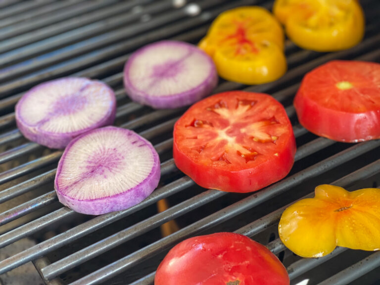 With the summer almost here I love noshing on a fresh salad full of flavor and crunch. One of my favorite summer salads is a grilled heirloom tomato and purple daikon burrata salad. It has the right balance of crunch and richness that makes it the perfect salad to enjoy with dinner or on its own. What makes the salad really sing is grilling the combination of heirloom tomatoes and pairing it with crisp purple daikon topped with velvety burrata cheese.