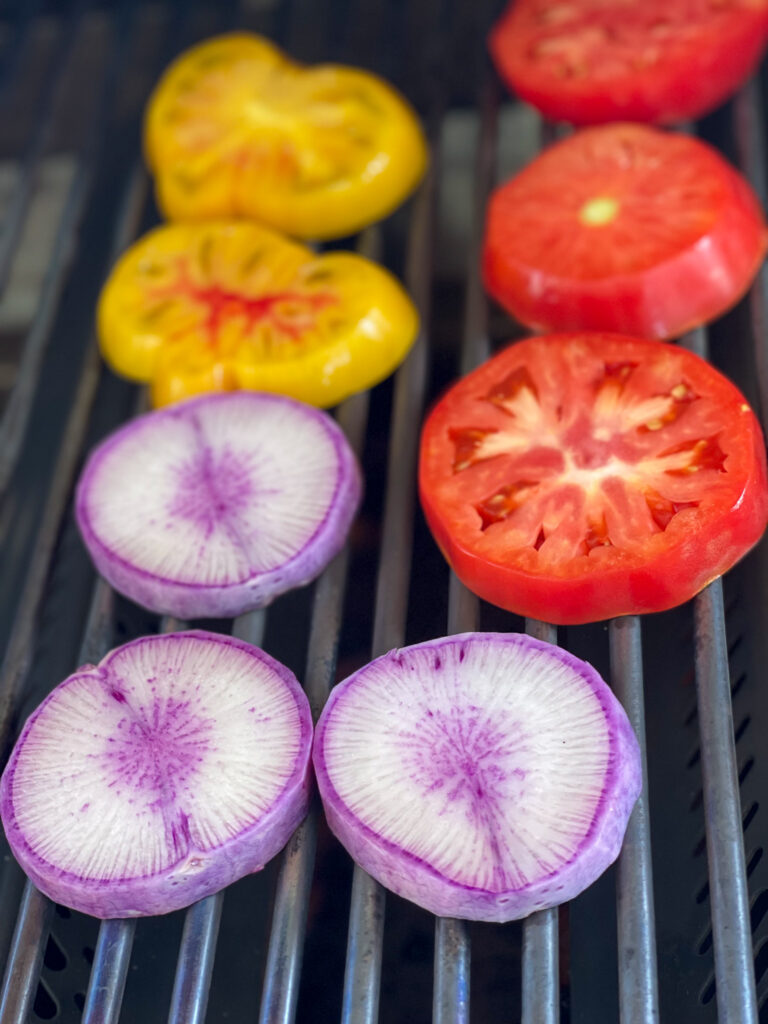 2. Place daikon and heirloom tomatoes on a medium preheated Bull Grill.
