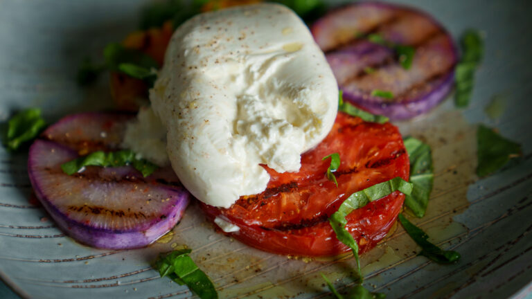 Grilled Heirloom Tomato & Purple Daikon Burrata Salad