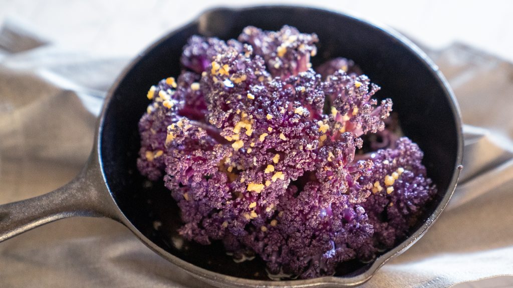 Purple cauliflower is considered a superfood and is charged full of antioxidants. It has a mild flavor with nutty nuances that really shine when grilled. The cauliflower doesn’t need much added to it although pairing with a little melted cheese or creamy dipping sauce is another way to serve it.