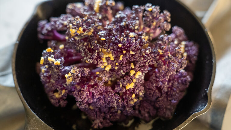Purple cauliflower is considered a superfood and is charged full of antioxidants. It has a mild flavor with nutty nuances that really shine when grilled. The cauliflower doesn’t need much added to it although pairing with a little melted cheese or creamy dipping sauce is another way to serve it.