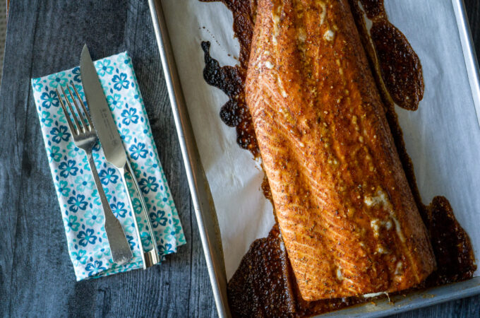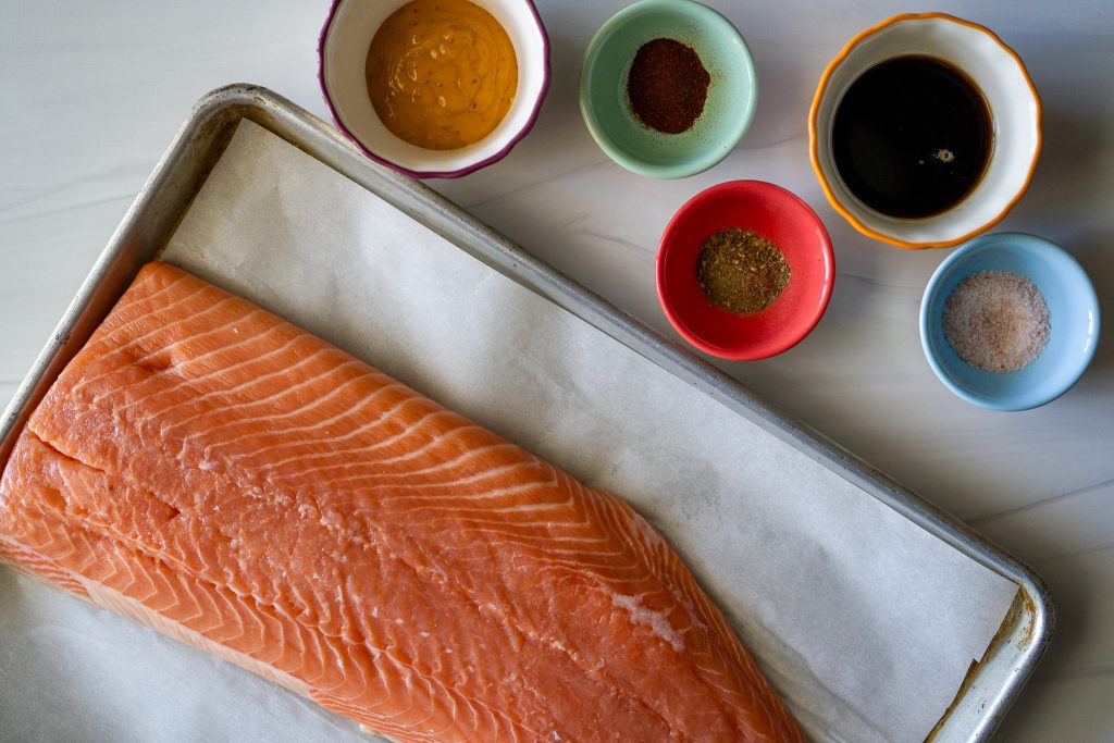 2. Line a heavy-duty sheet tray with parchment paper and place salmon on top