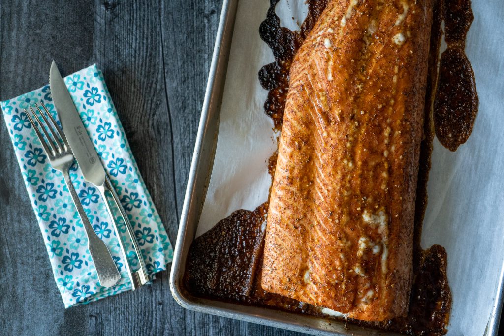 Grilling a whole salmon fillet with guajillo maple glaze makes for a great presentation and an awesome dinner for my family and friends! Sometimes though, grilling fish on a grill can take a little patience and practice. That’s why I love reducing the hassle by using indirect heat on my Bull Gas Grill to perfectly cook my salmon every time.