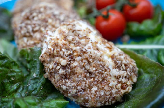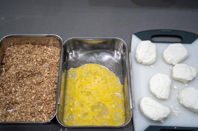 6. Dredge goat cheese pucks in almond flour and shake off excess.