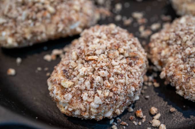 8. Then place cheese pucks in the nut mixture, covering the entire surface with nuts. Press the nuts lightly into the cheese. Place on a lightly greased cast iron and repeat process until all the goat cheese has been coasted in nuts.