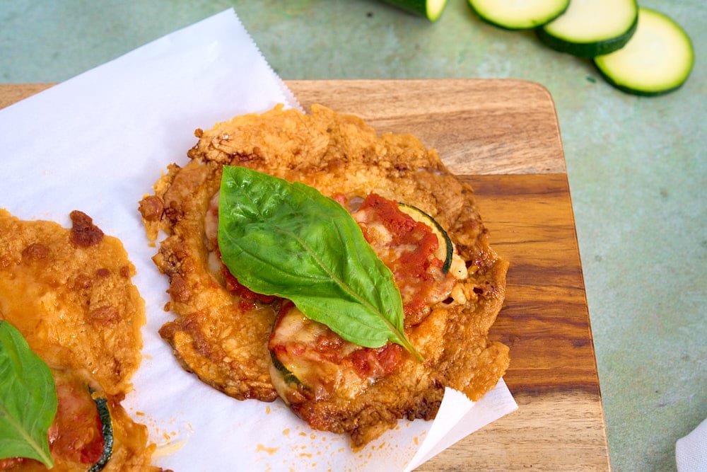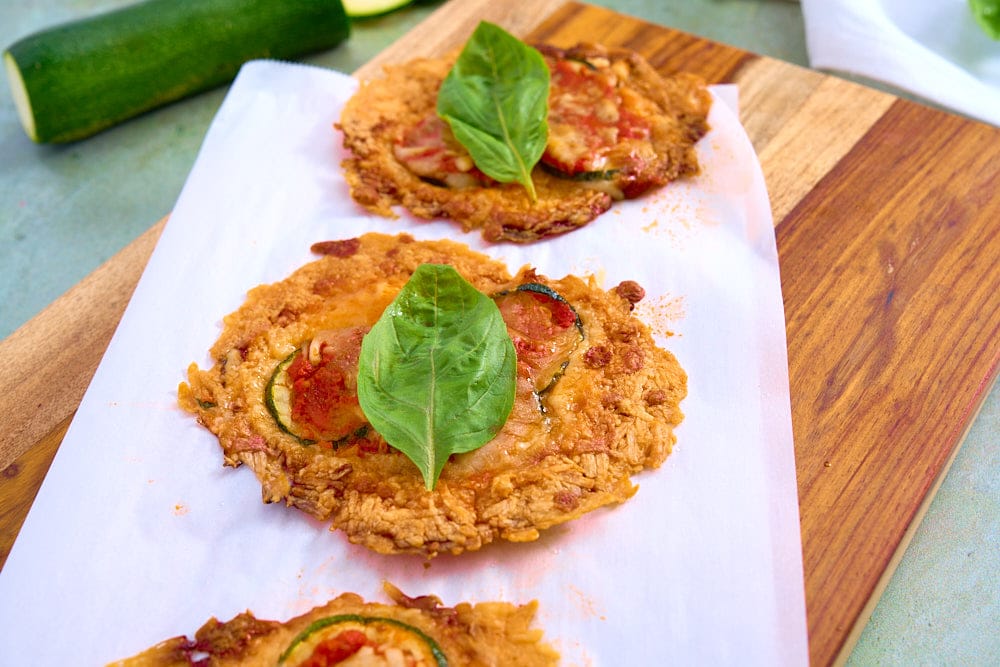 - Top the melted cheese with zucchini. Spoon a tablespoon of pizza sauce on top of the zucchini. Then sprinkle mozzarella cheese over the zucchini and pizza sauce.